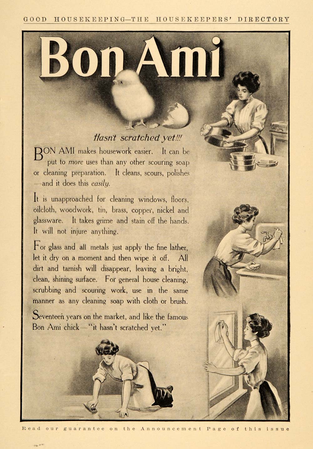 This is an original 1909 black and white print ad for the Bon Ami Powdered Household Cleaner from Bon Ami Company.