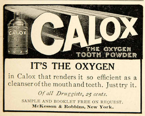 This is an original 1909 black and white print ad for Calox oxygen tooth powder that was made and sold by McKesson & Robbins of New York, NY during the Edwardian era.