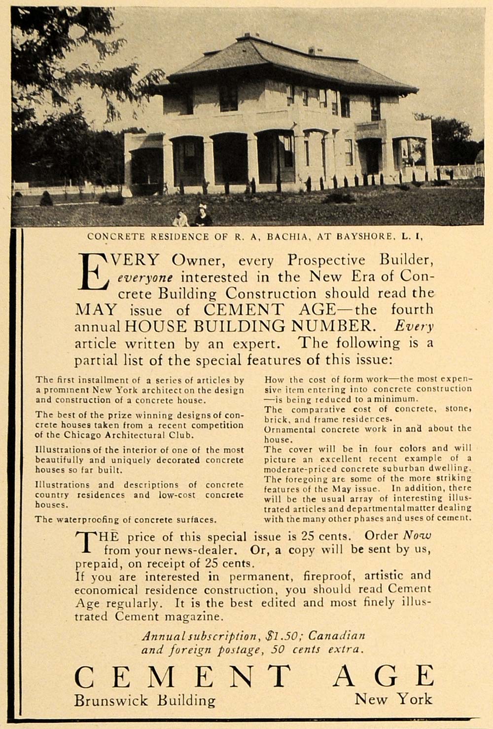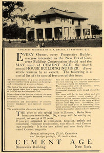 This is an original 1909 black and white print ad for Cement Age magazine located in the Brunswick Building, New York City, New York. This ad shows the concrete residence of R. A. Bachia in Bayshore, Long Island.
