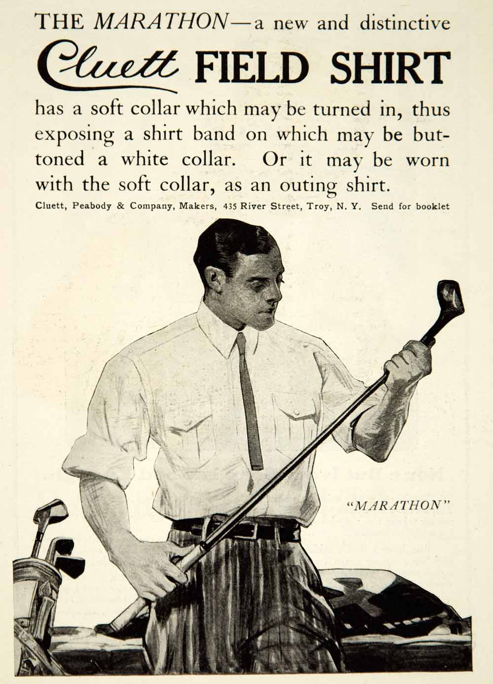 This is an original 1909 black and white print ad for the Marathon men's field dress shirts that were made and sold by Cluett, Peabody & Company of 435 River Street, Troy, New York (NY).