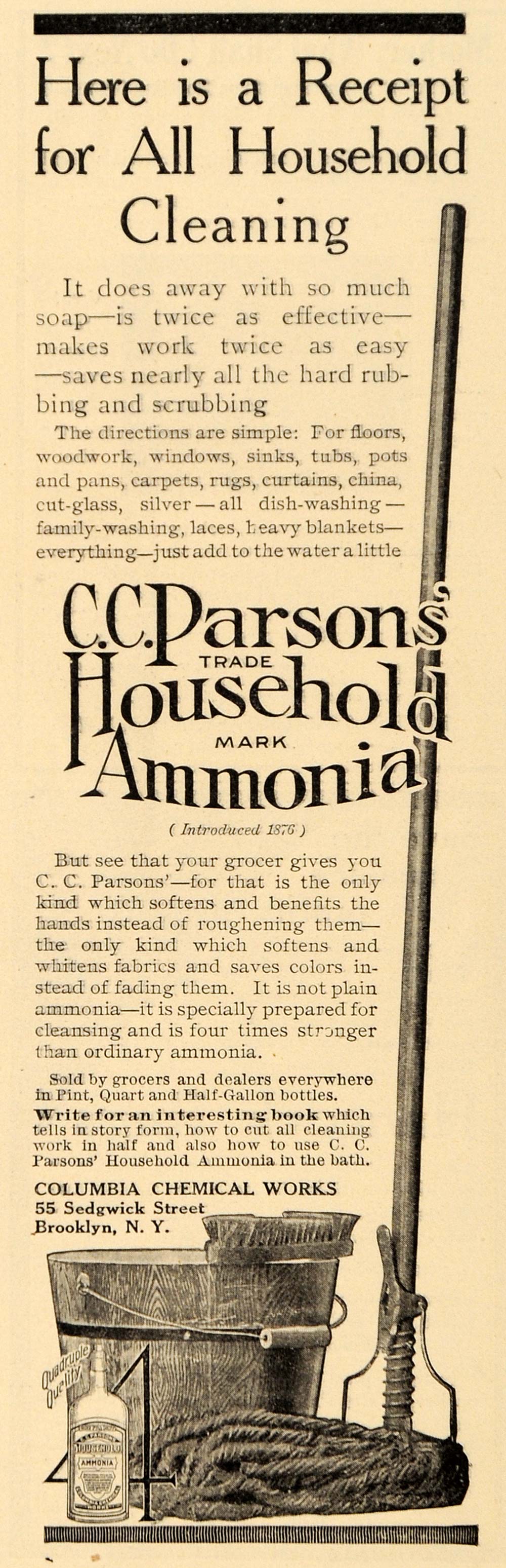 This is an original 1909 black and white print ad for the C. C. Parsons' Household Ammonia from Columbia Chemical Works located at 55 Sedgwick Street, Brooklyn, New York.