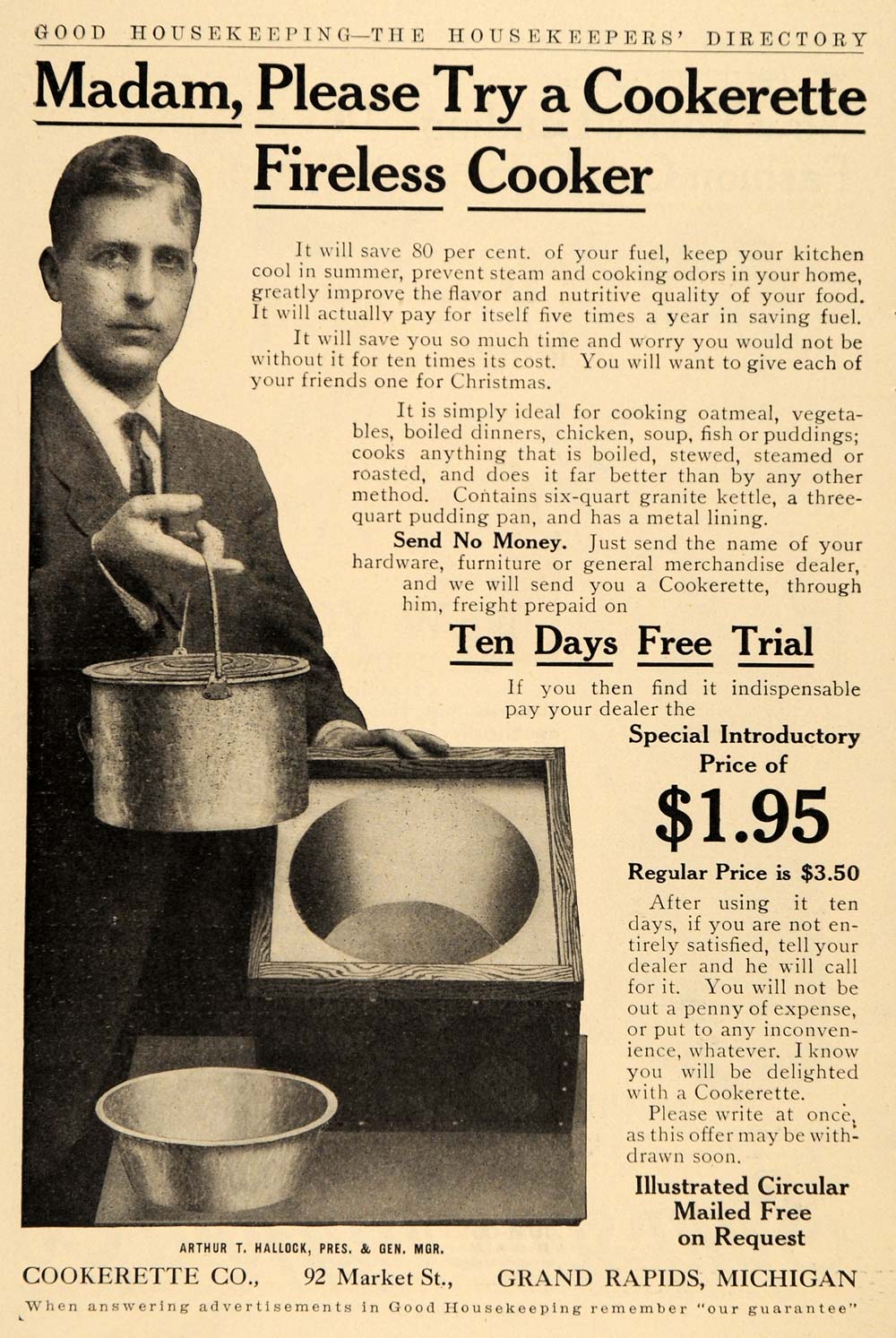 This is an original 1909 black and white print ad for the Cookerette Fireless Cooker from Cookrette Company located at 92 Market Street, Grand Rapids, Michigan.
