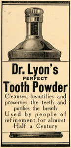 This is a small original 1909 black and white print ad for Dr. Lyon's Perfect Tooth Powder by I. W. Lyon & Sons, Inc. They are located at 545 W. 27th Street, New York City.