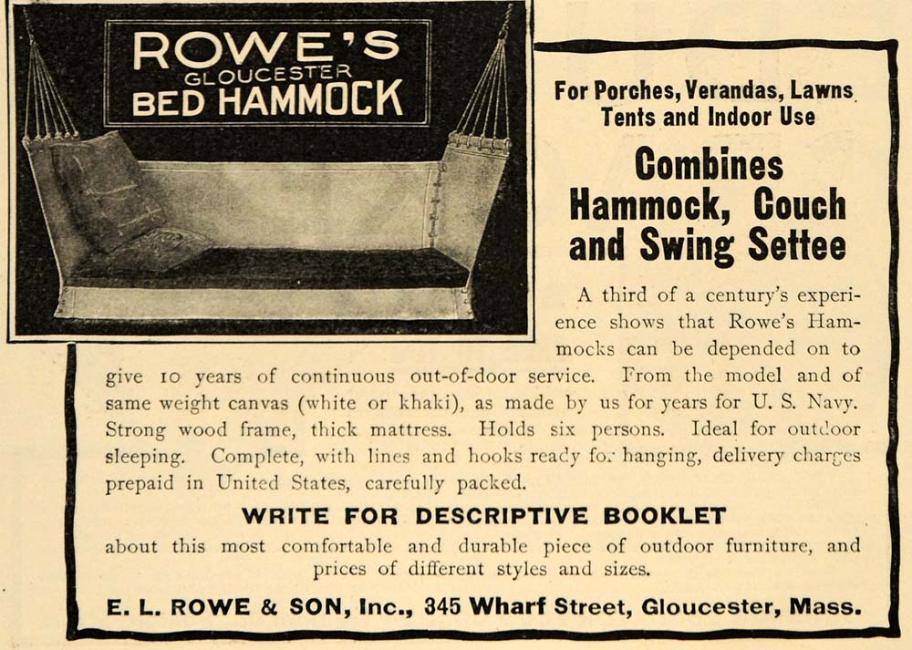 This is an original 1909 black and white print ad for the Rowe's Gloucester Bed Hammock, combines Hammock, Couch and Swing Settee from E. L. Rowe & Sons, Incorporation located at 345 Wharf Street, Gloucester, Massachusetts.