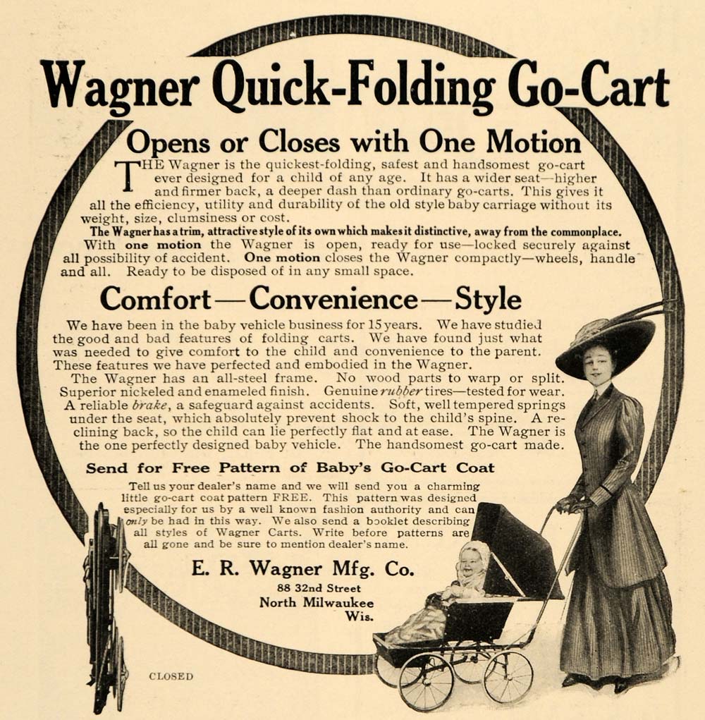 This is an original 1909 black and white print ad for the Wagner Quick-Folding Baby Go-Cart from E. R. Wagner Manufacturing Company located at 88 32nd Street, North Milwaukee, Wisconsin.