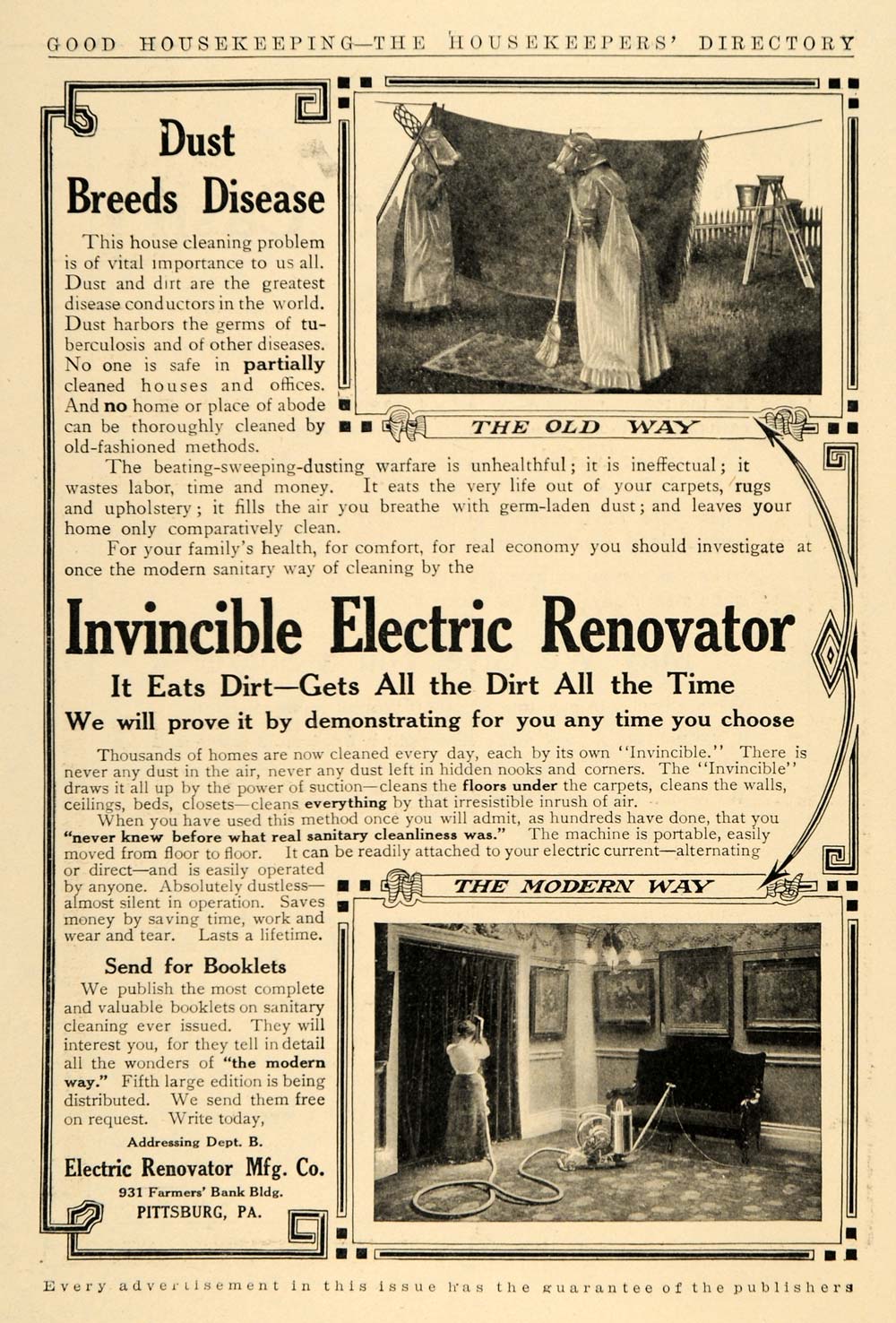 This is an original 1909 black and white print ad for the Invincible Electric Renovator from Electric Renovator Manufacturing Company located in Pittsburgh, Pennsylvania.