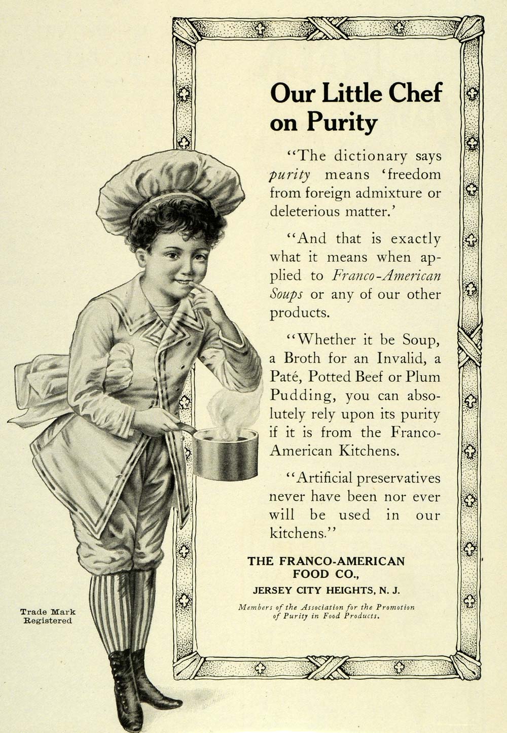 This is an original 1909 black and white print ad for the Franco-American Food Company of Jersey City Heights, New Jersey; this ad features their Franco-American Soups.