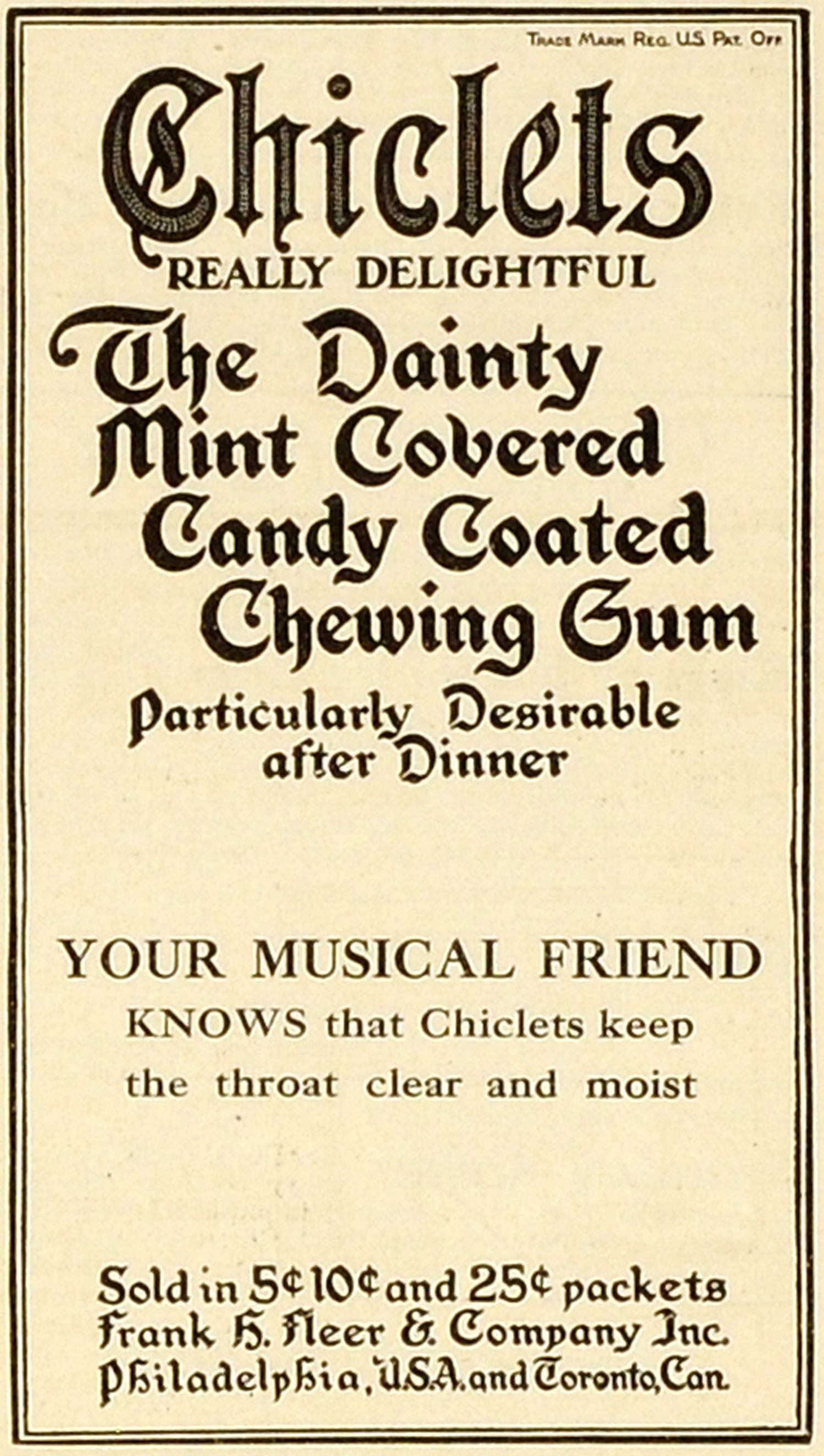 This is a small original 1909 black and white print ad for Chiclets, a product by Frank Fleer and Company, Inc. of Philadelphia, Pennsylvania.