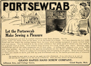 This is an original 1909 black and white print ad for the Portsewcab, for hand sewing from Grand Rapids Hand Screw Company located in Grand Rapids, Michigan.
