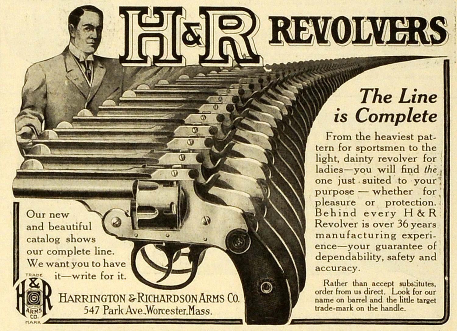 This is an original 1909 black and white print ad for H and R Revolvers, a product by the Harrington and Richardson Arms Company, located at 547 Park Avenue in Worcester, Massachusetts.