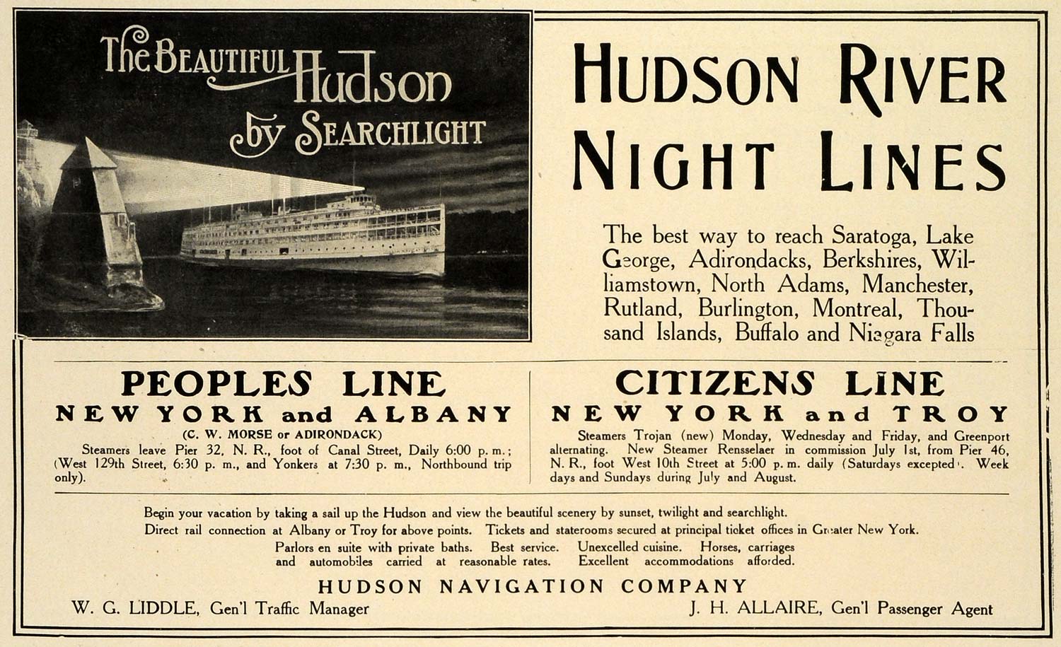 This is an original 1909 black and white print ad for the Hudson River Night Lines, featuring the Peoples Line to New York and Albany and the Citizens Line to New York and Troy.