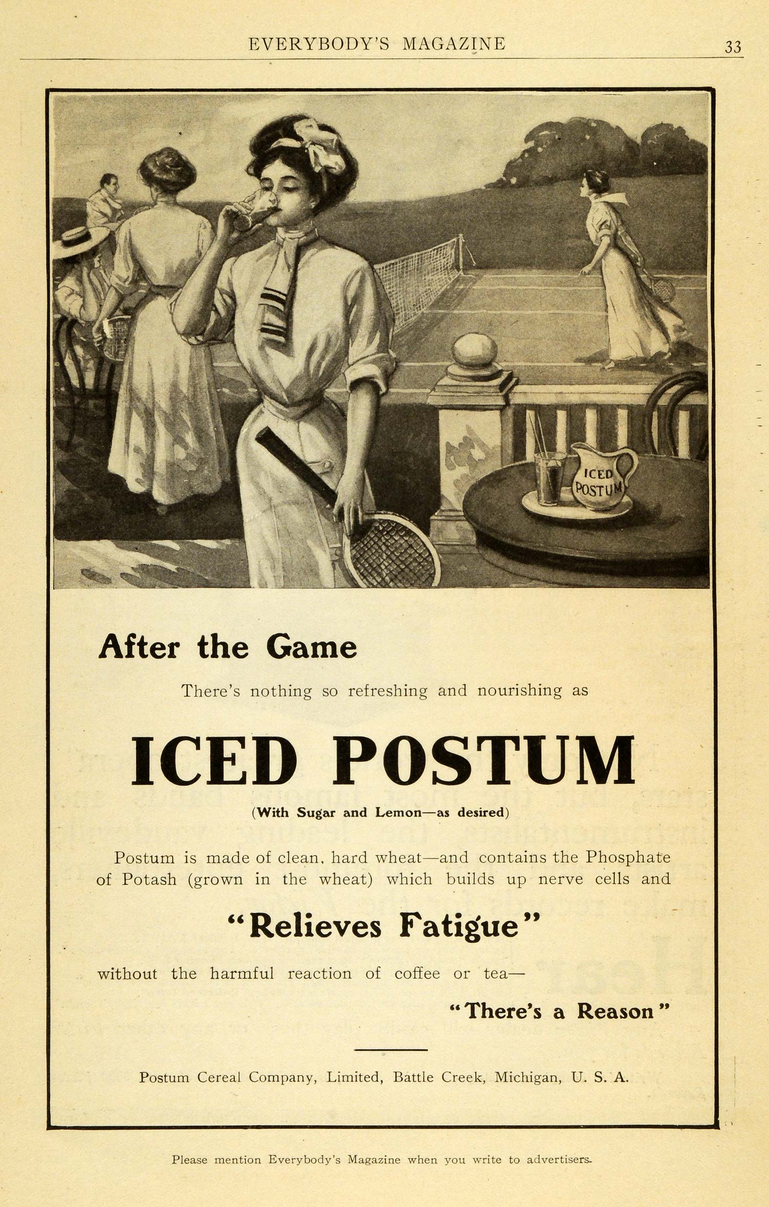 1909 Ad Iced Postum Coffee Caffeine Alternative Relieves Fatigue Female EM2
