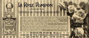 This is an original 1909 black and white print ad for La Rose Pompon by Bourjois Paris (makers of the famous Java Face Powder) located at 48 West 4th Street, New York City, New York.