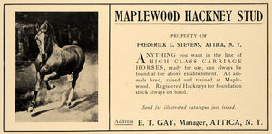 This is an original 1909 black and white print ad for High Class Carriage Maplewood Hackney Stud Horses.