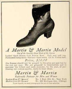 This is an original 1909 black and white print ad for the ladies' black Russia calf button boots that were made and sold by Martin & Martin of 1 East 35th Street, New York, NY and 183 Michigan Avenue, Chicago, Illinois (IL) during the Edwardian era.