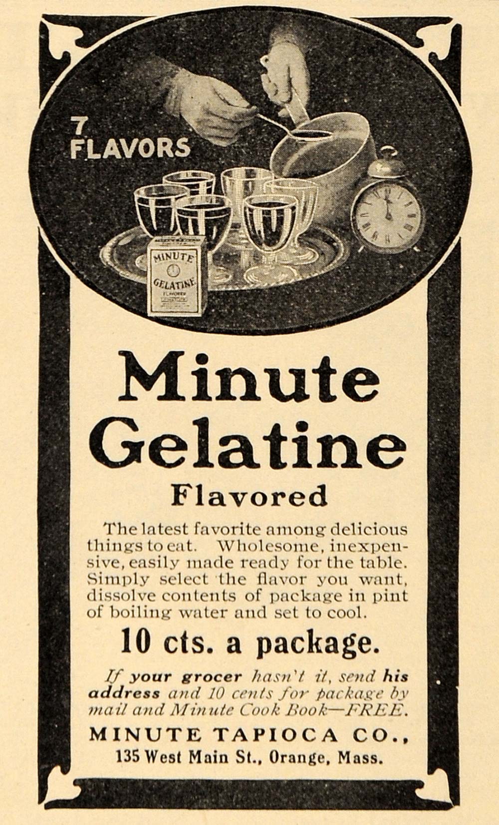 This is an original 1909 black and white print ad for the Minute Gelatine Flavored from Minute Tapioca Company located at 135 West Main Street, Orange, Massachusetts.