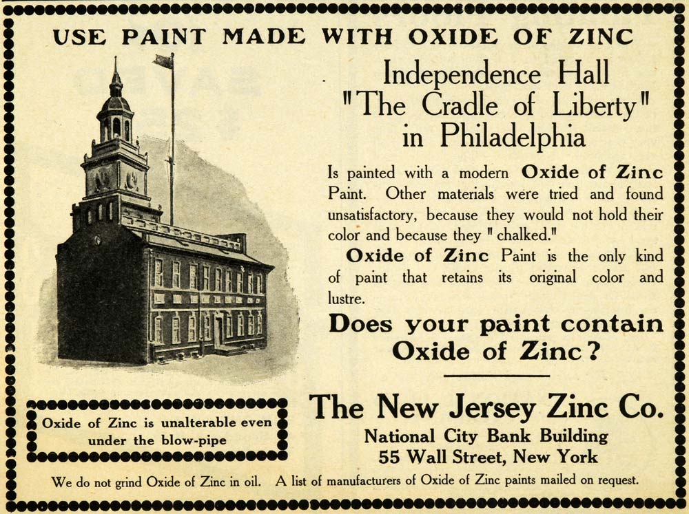 This is an original 1909 black and white print ad for The New Jersey Zinc Company, located in the National City Bank Building at 55 Wall Street in New York. This particular ad features the Independence Hall in Philadelphia, which was painted with the company's oxide of zinc.