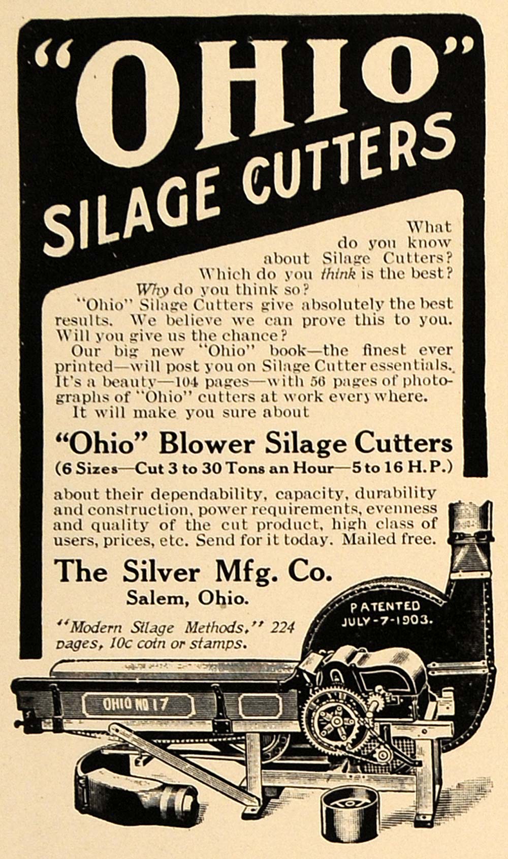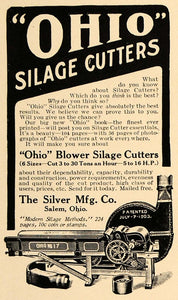 This is an original 1909 black and white print ad for "Ohio" Blower Silage Cutters, a product of The Silver Manufacturing Company, located in Salem, Ohio.