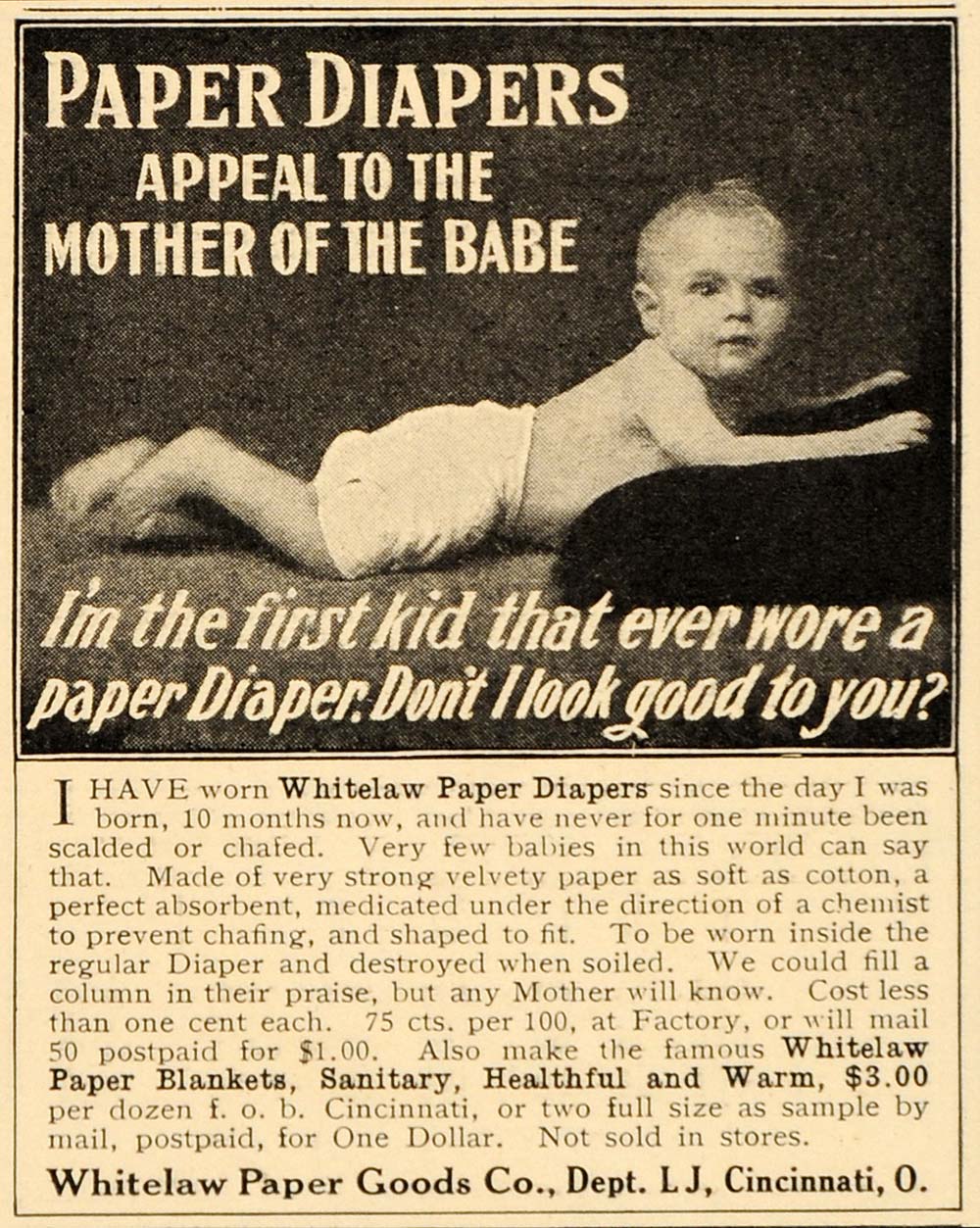 This is an original 1909 black and white print ad for Whitelaw Paper Diapers and Paper Blankets by Whitelaw Paper Goods Company located at Department LJ, Cincinnati, Ohio.
