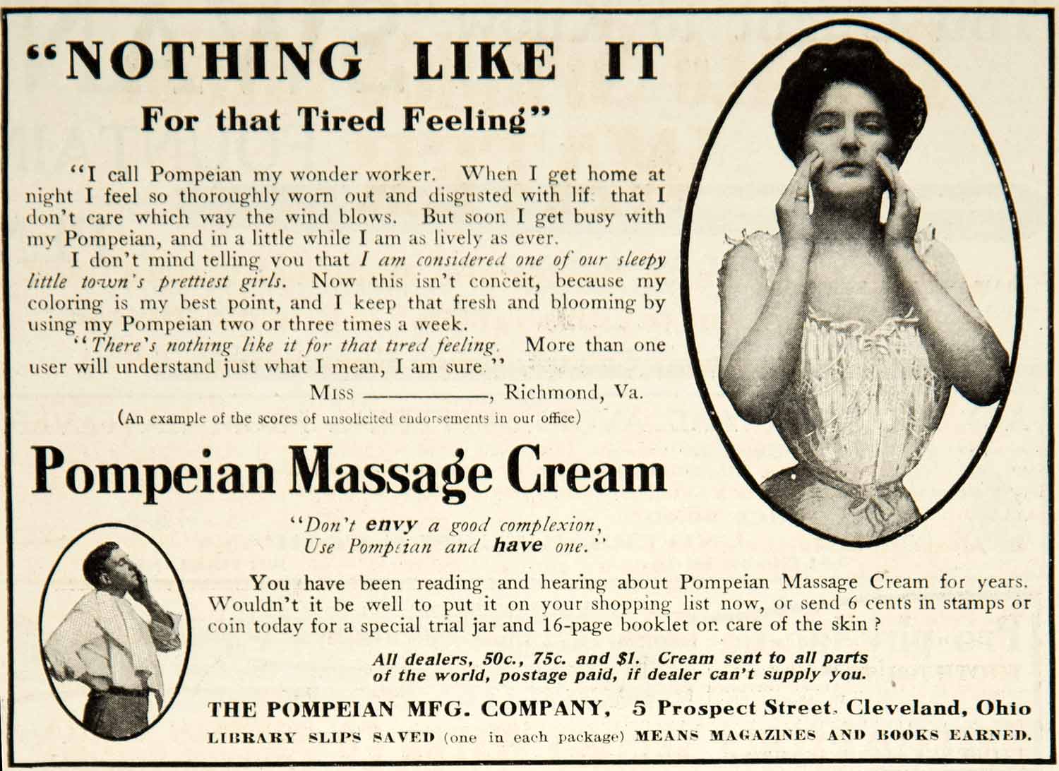 This is an original 1909 black and white print ad for facial massage cream that was made and sold by the Pompeian Manufacturing Company of 5 Prospect Street, Cleveland, Ohio (OH) during the Edwardian era.