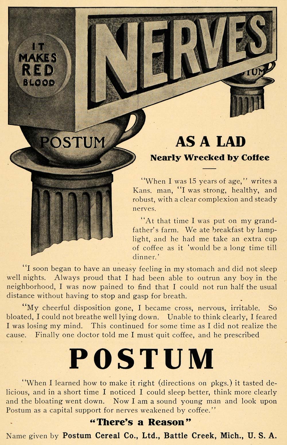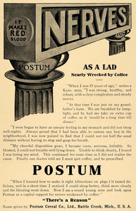 This is an original 1909 black and white print ad for the Postum, a caffeine-free beverage from Postum Cereal Company, Ltd. located in Battle Creek, Michigan.