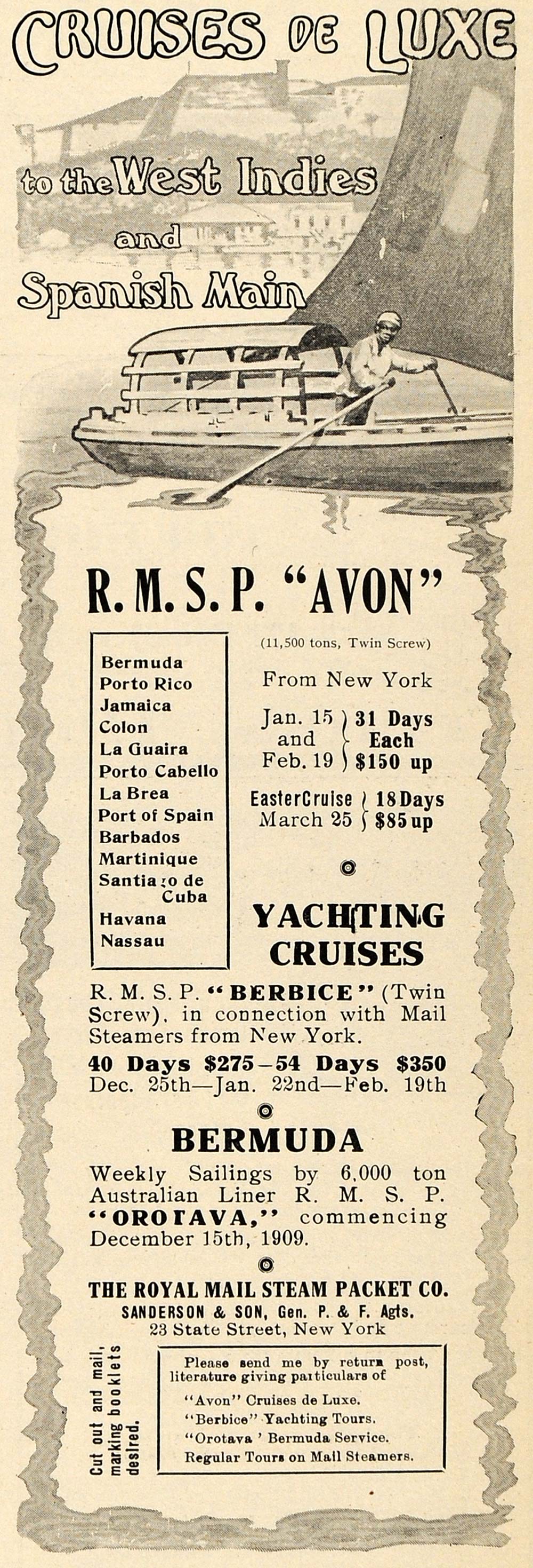 This is an original 1909 black and white print ad for the Royal Mail Steam Packet Company.