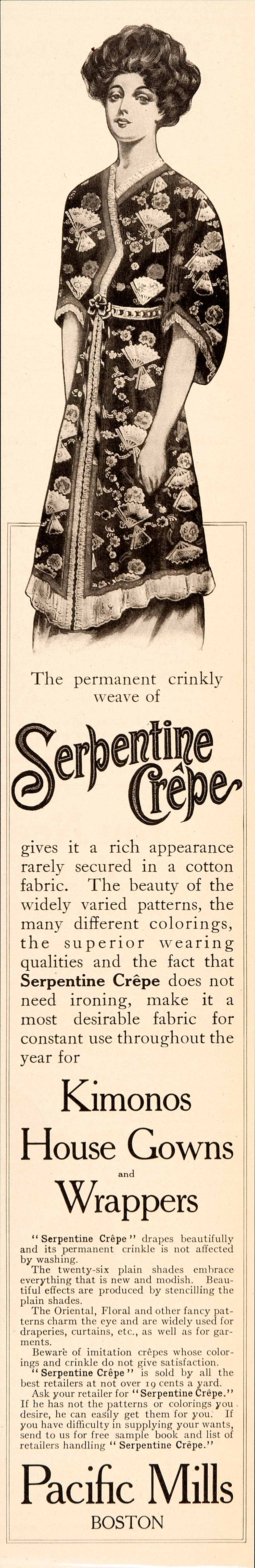 This is an original 1909 black and white print ad for Serpentine Crepe Kimonos, House Gowns, and Wrappers from Pacific Mills located in Boston. This is a simple ad with a beautiful illustration of a women wearing one of these elegant crinkly free kimonos.