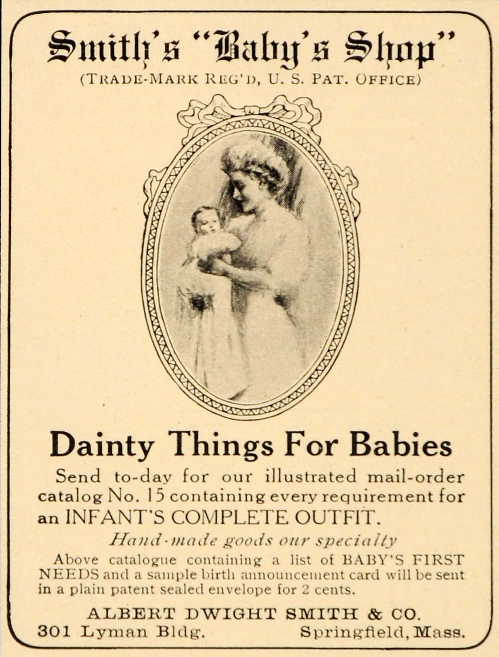 This is an original 1909 black and white print ad for Smith's "Baby's Shop" by the Albert Dwight Smith and Company located at 301 Lyman Building, Springfield, Massachusetts.