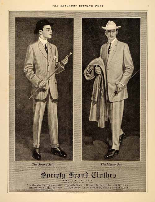 This is an original 1909 black and white print ad for Society Brand Clothes. The ad features images of the Strand Suit and the Master Suit.