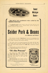 This is an original 1909 black and white print ad promoting Snider Pork & Beans from