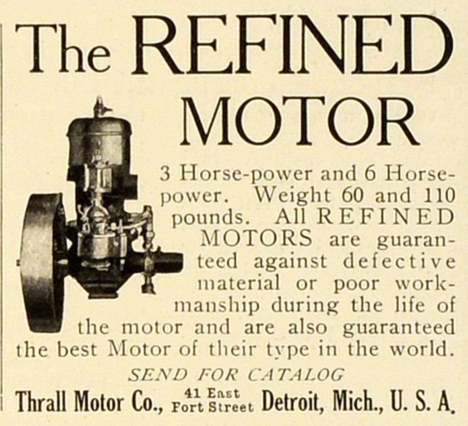 This is a small original 1909 black and white print ad for the Refined Motor, a product by the Thrall Motor Company, located at 41 East Fort Street in Detroit, Michigan.
