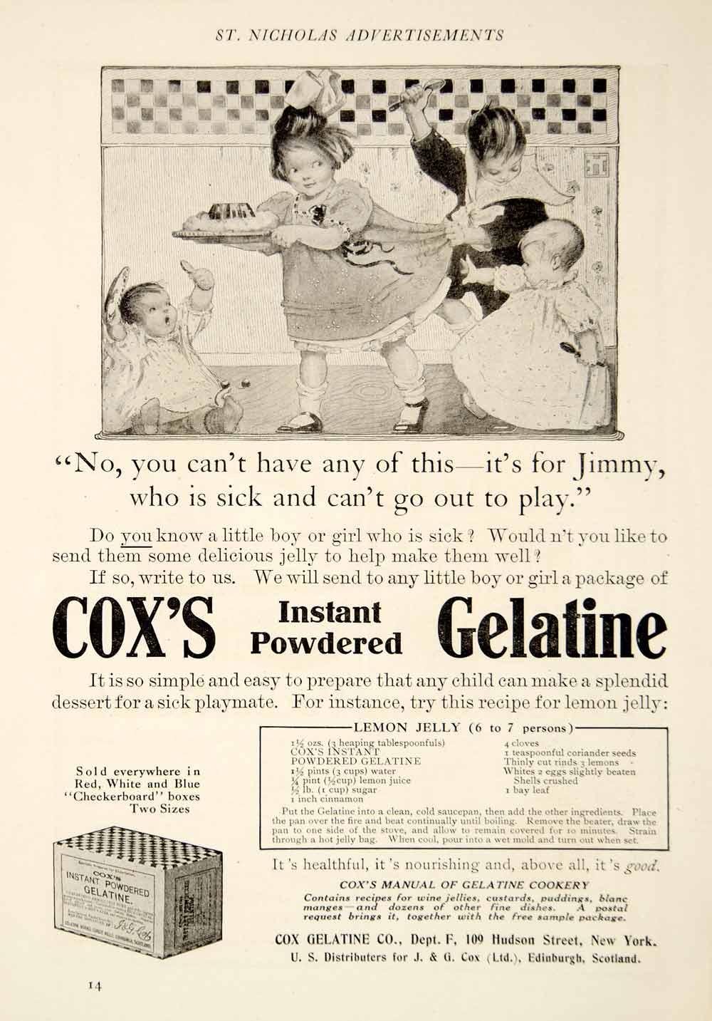 This is an original 1909 black and white print ad for Cox's Instant Powdered Gelatine from the Cox Gelatine Co., 109 Hudson Street, New York City. The ad includes a recipe for Lemon Jelly.