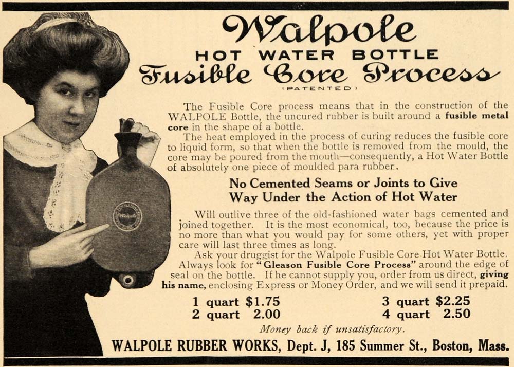 This is an original 1909 black and white print ad for the Walpole Hot Water Bottle from Walpole Rubber Works located at 185 Summer Street, Boston, Massachusetts.