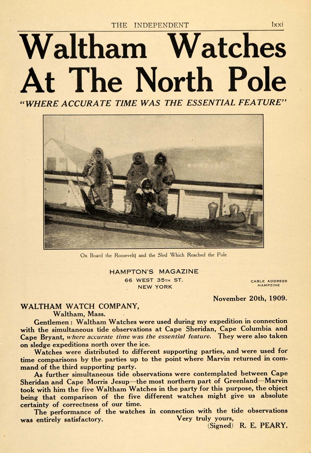 This is an original 1909 black and white print ad for Waltham Watches, specially featured at the North Pole on board the Roosevelt and the sled that reached the North Pole. This company began its operation in 1850, under the ownership of David Davis, Edward Howard and Aaron Lufkin Dennison. In a tribute to the Gettysburg Address, a William Ellery key wind watch (Model 1857) was presented to Abraham Lincoln.