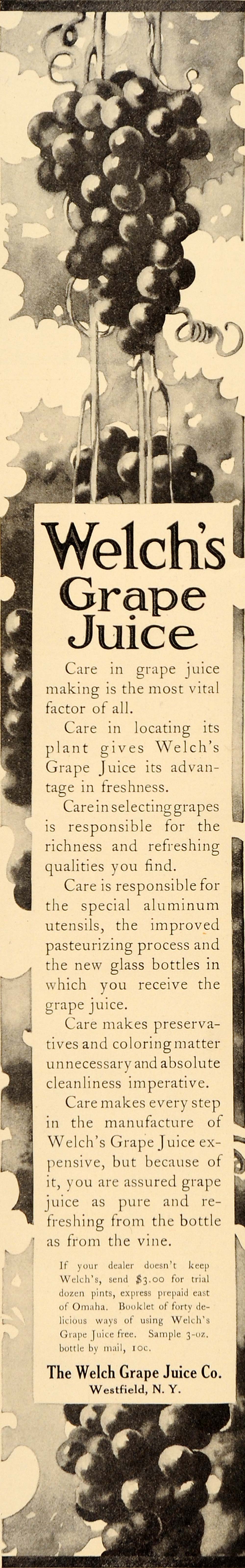 This is an original 1909 black and white print ad for Welch's Grape Juice made by The Welch Grape Juice Company in Westfield, NY.