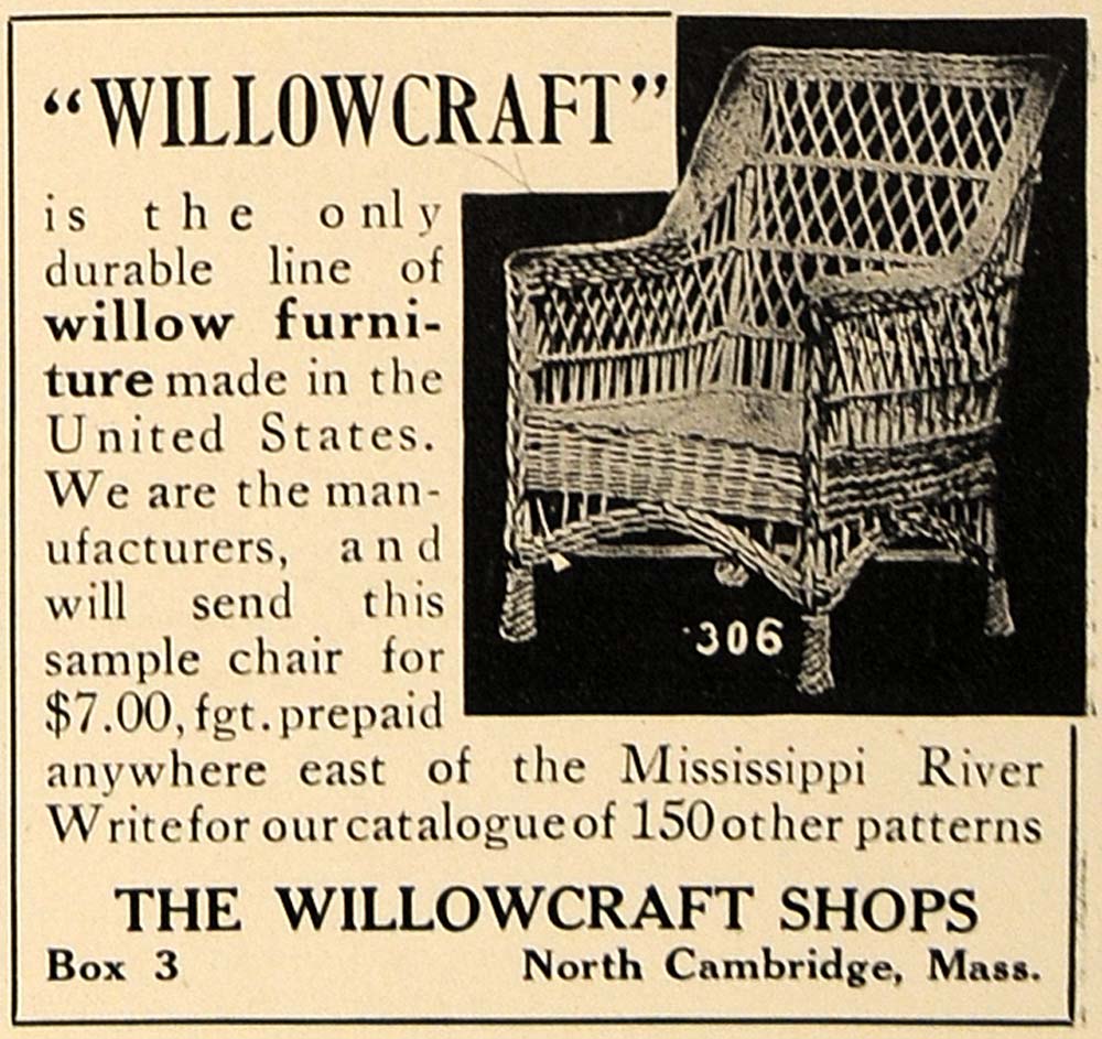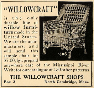 This is an original 1909 black and white print ad for willow furniture by The Willowcraft Shops located in North Cambridge, Massachusetts.