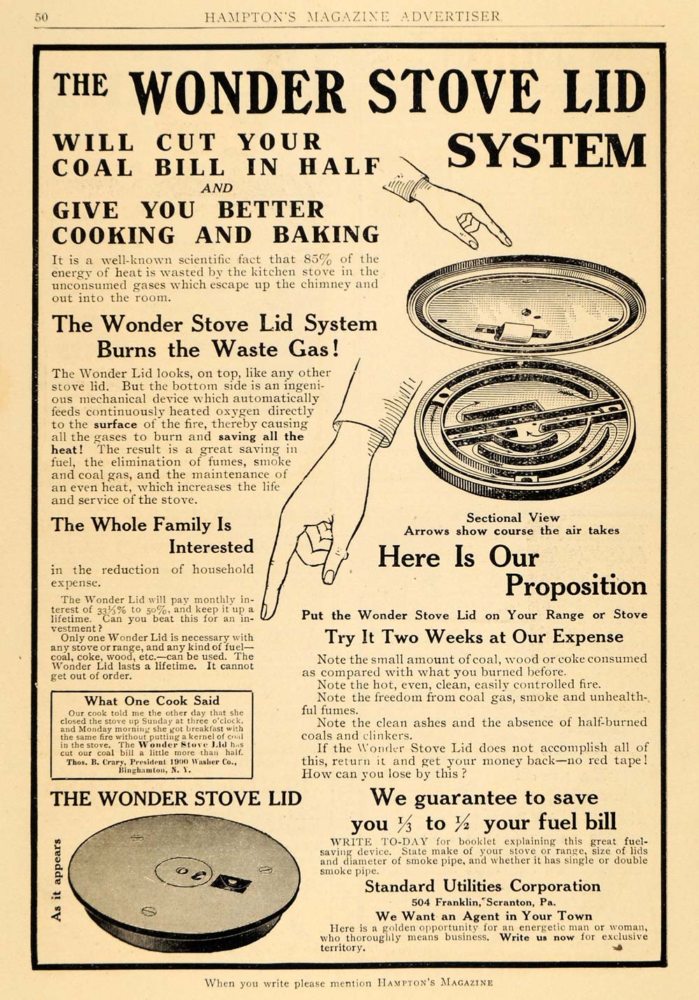 This is an original 1909 black and white print ad for The Wonder Stove Lid System, a product by Standard Utilities Corporation, located at 504 Franklin in Scranton, Pennsylvania.