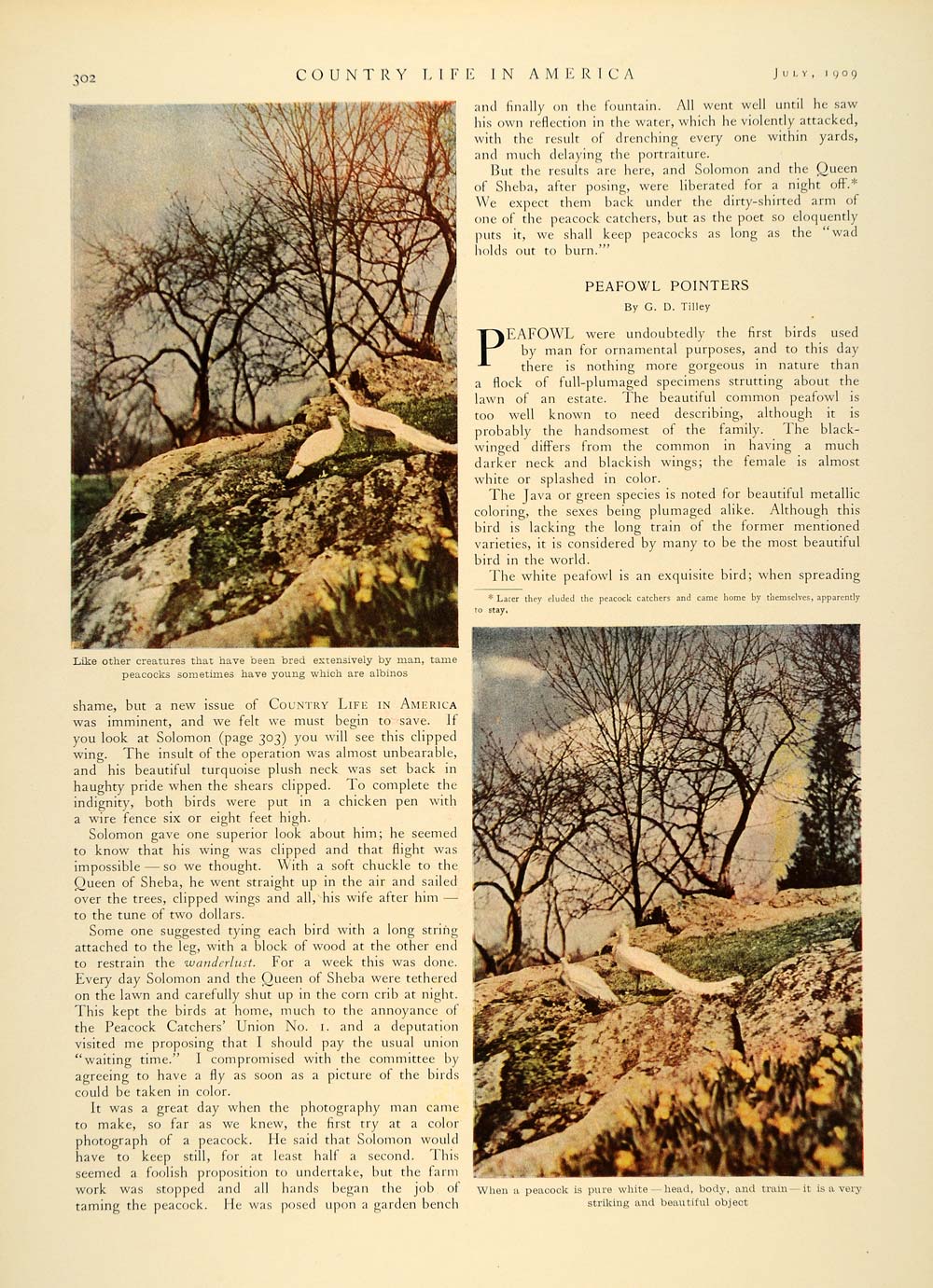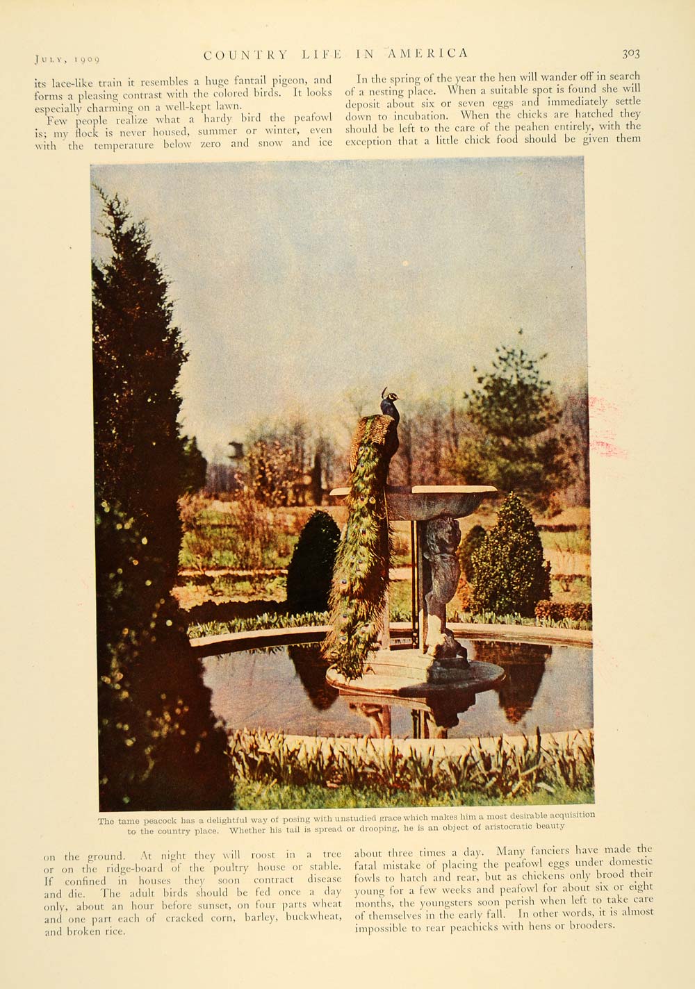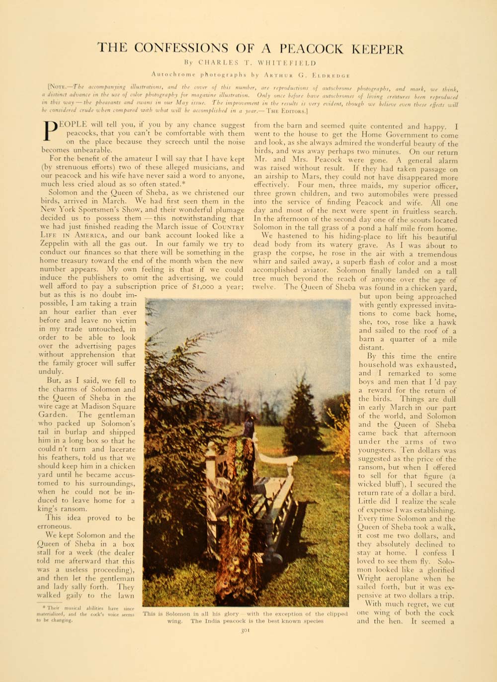This is an original 1909 4 page (2 double-sided pages) article by Charles T. Whitefield with photography by Arthur G. Eldredge on how one man cares for his peacocks, as well as pointers and tips for others looking to keep peacocks on their property. Please see additional images.