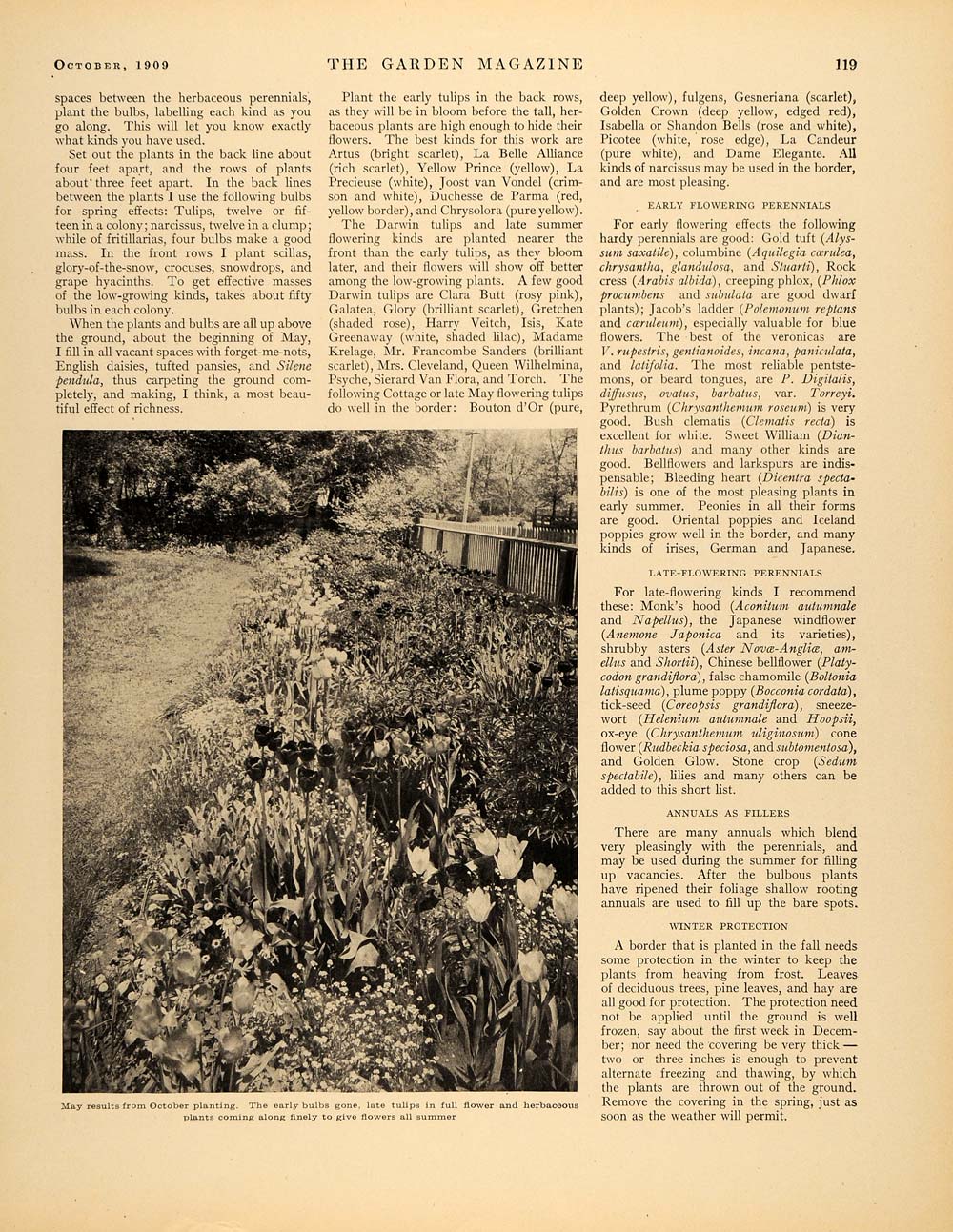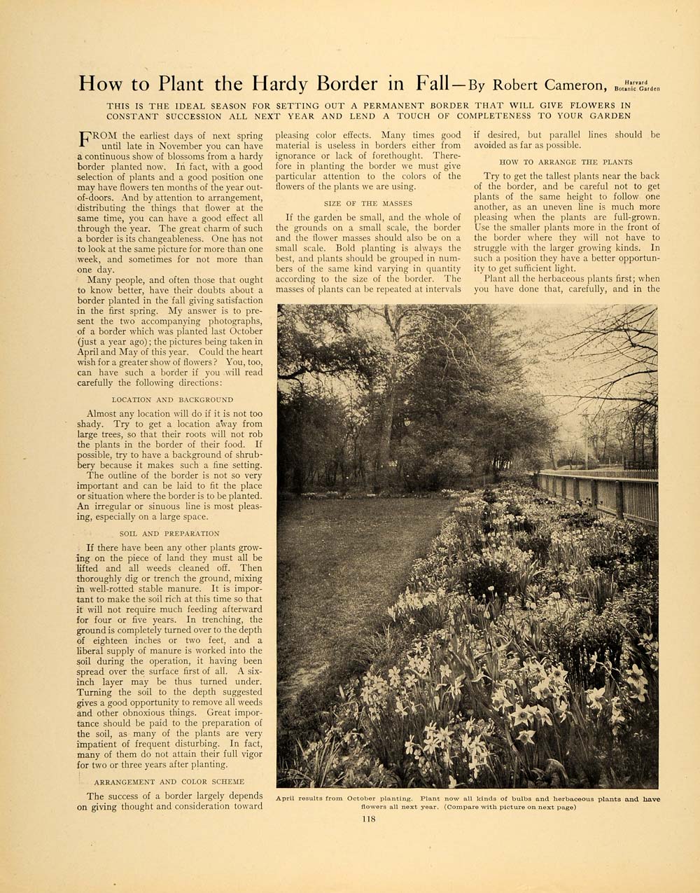 This is an original 1909 2 page article in a garden magazine entitled, "How to Plant the Hardy Border in Fall" by Robert Cameron of the Harvard Botanic Garden. He discusses planting perennials in October and enjoying them in April.