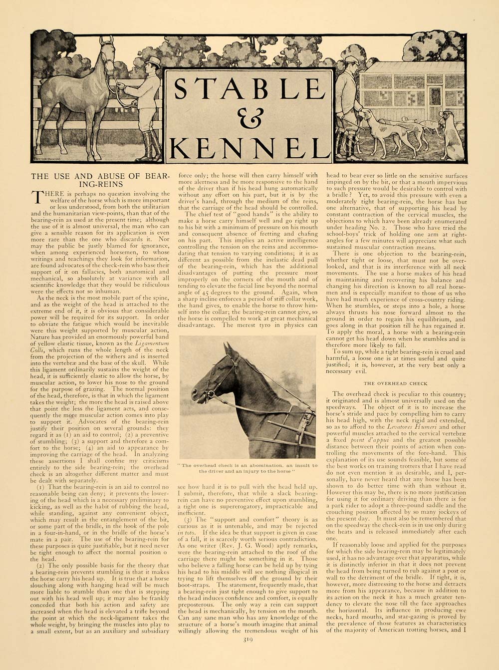 This is an original 1909 2 page (1 double-sided page) article by Albro C. Gaylor and N. Newnham-Davis on the use and abuse of bearing reins and the overhead check harness, as well as information on the Bulldog breed. Please see additional image.