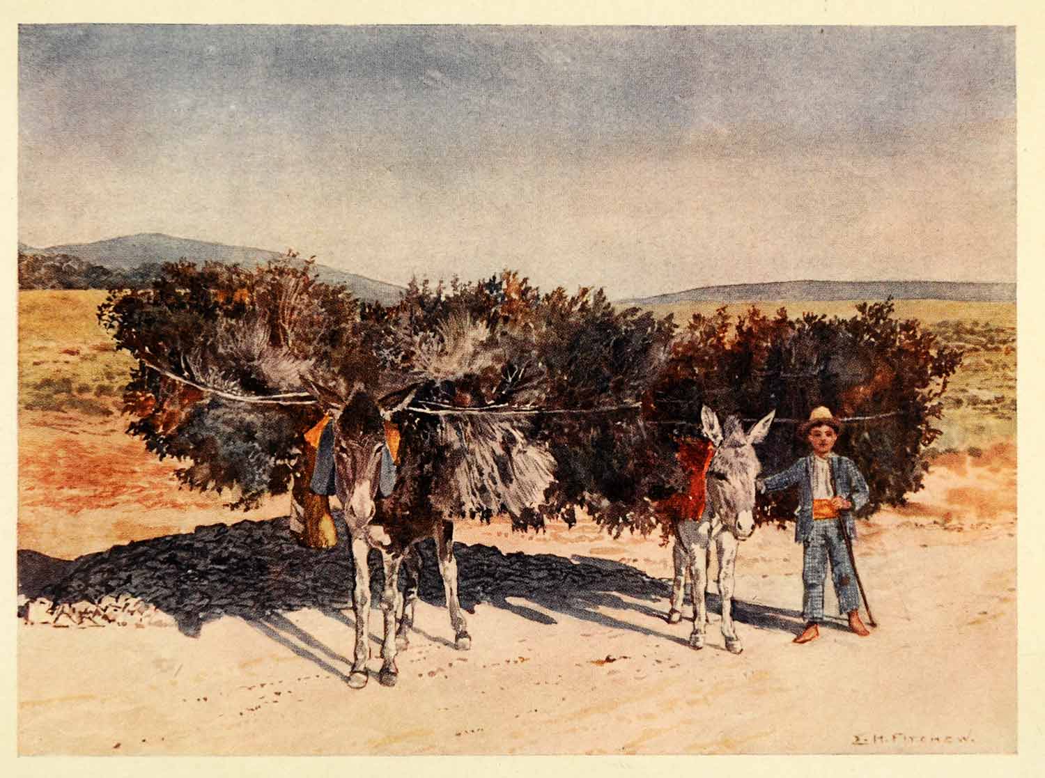 This is an original 1909 color print of "Donkeys Laden With Brushwood," by E.H. Fitchew.