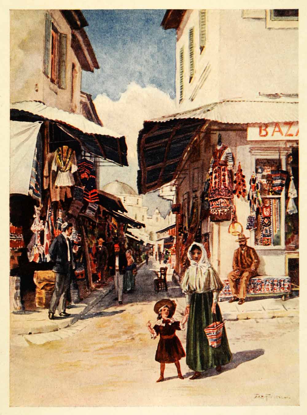 This is an original 1909 color print of "A Street in Athens," by E.H. Fitchew.