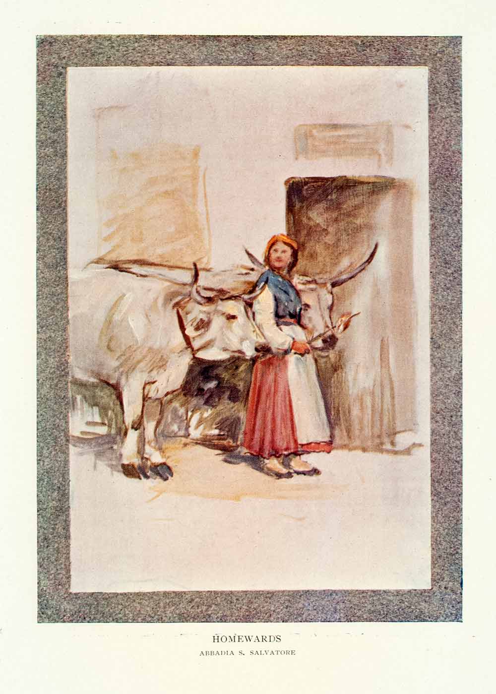 This is an original 1909 color print of a young woman leading her cows home somewhere in Tuscany, Italy.