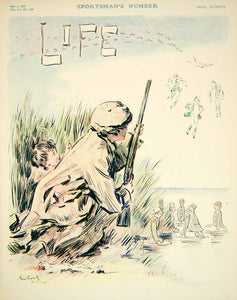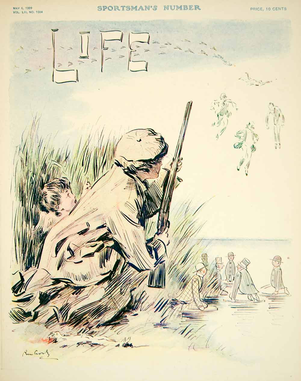 This is an original 1909 color cover for Life magazine, May 6, 1909, that features an illustration of a female duck hunter.