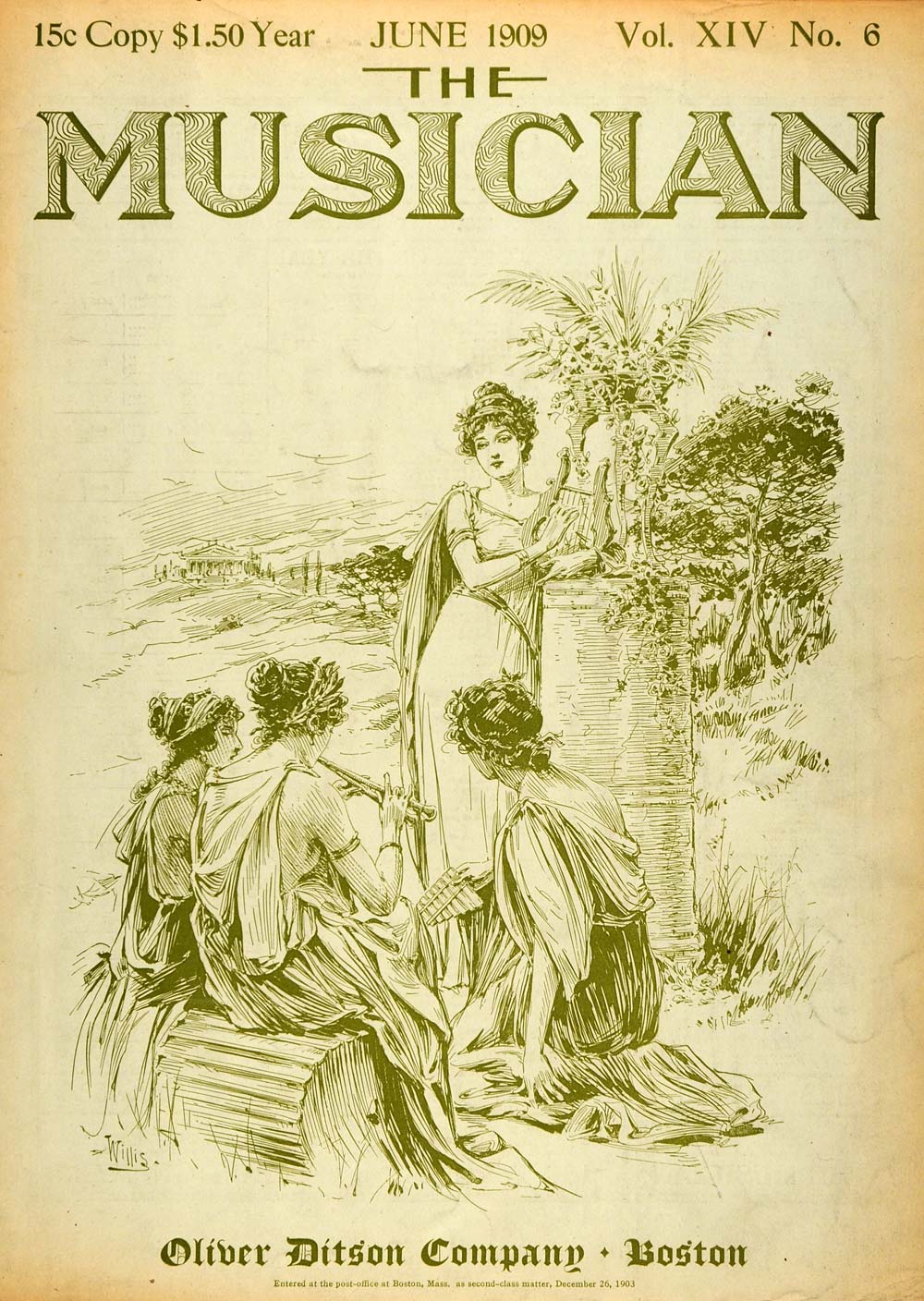 This is an original 1909 color cover for The Musician Magazine for June (Vol. XIV, No. 6) from the Oliver Ditson Company of Boston, Massachusetts. This cover features artwork by the artist "Willis".CONDITION