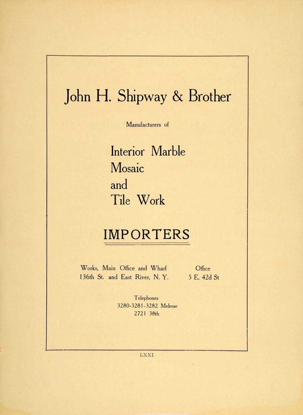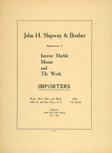 This is an original 1909 print ad for John H. Shipway & Brother, Manufacturers of Interior Marble, Mosaic, and Tile Work, New York City.