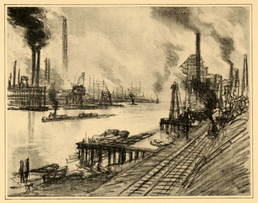 This is an original 1909 halftone print by Joseph Pennell of the Staten Island Factories.