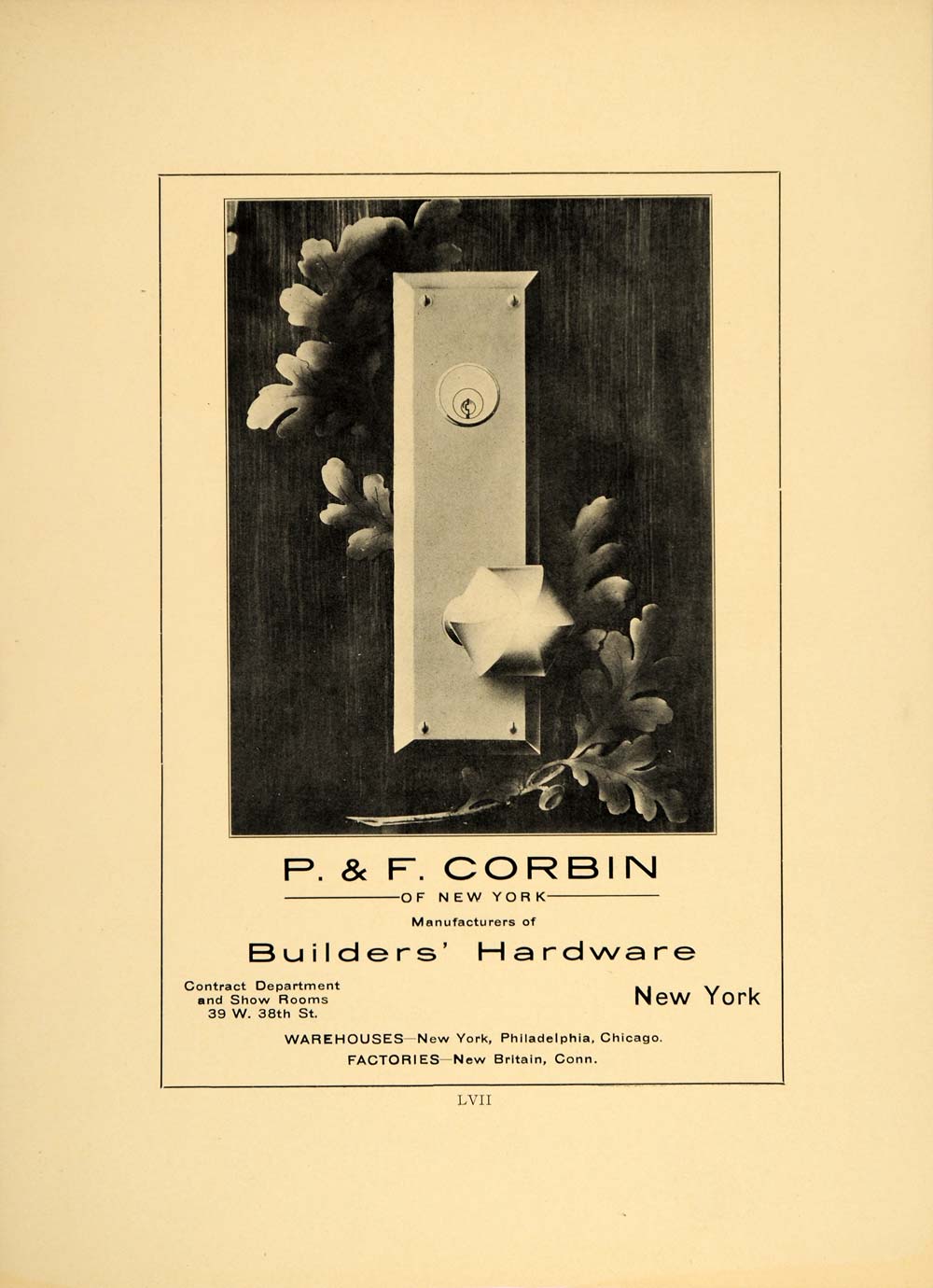 This is an original 1909 print ad for P. & F. Corbin of New York, Manufacturers of Builders' Hardware.