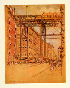 This is an original 1909 color print by Joseph Pennell of Elevated Railroad (the "El"or "L") at 125th Street in New York City.