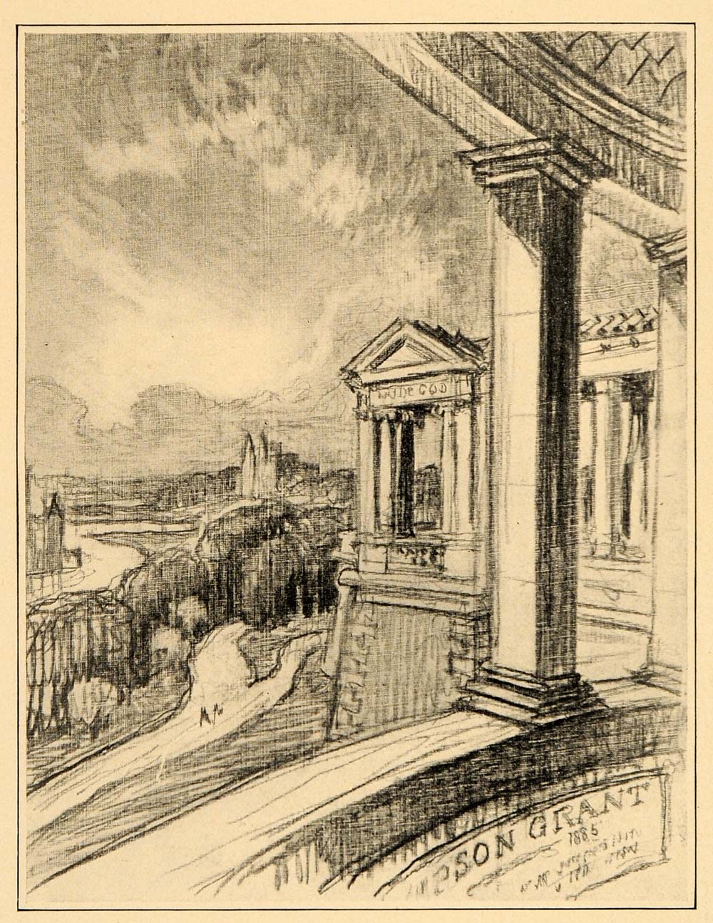 This is an original 1909 halftone print by Joseph Pennell of the Hall of Fame at the University of New York.